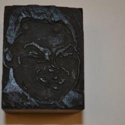 Small, rectangular, wood printing blookc with the image of a man's face. The picture is tight closeup only including his head and very little of his neck. The details of his face and hair are made with thick lines and contrasted with large areas that would be printed without any color.
