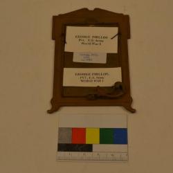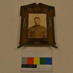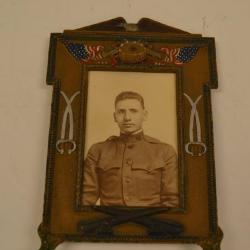 Framed picture of Pvt. George Phillos of the U.S. Army during WWI. The photo itself is 3.5 x 5". The photo is a sepia tone, and it shows Pvt. George Phillos in Army uniform, against a plain white backdrop. Around the photograph is a metal frame. The frame's base color is a gold color, while the details of the frame are painted according to what they are. The frame is a rectangular shape, with patterned details along the perimeter and edges. These details along the perimeter and the corners seem to have some slight discoloration to them, showing up a greenish color. At the bottom of the frame, are two small cannons, painted brown, and crossing each other. On each side of the frame, there are two, silver swords crossing each other. And then at the top portion of the frame, there is a snare drum, colored gold, with two golden trumpets or horned instruments coming out of each side of the drum, and slightly past that, there are two American flags by each of the horned instruments. Laying on the very top, technically above the frame, is a bald eagle, spreading its wings to rest on the top of the frame. The eagle is looking left (when looking at the frame). The back of the frame has a small, ornate stand that allows the picture frame to be propped up against itself.