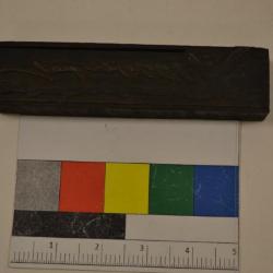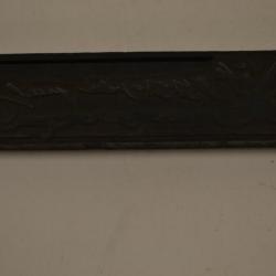 Long, rectangular, wooden printing block. The plate has a signature next to a logo of a quill sitting in an ink well next to a stack of books. A row of open books are laying under the signature. Backwards, and having been worn down, the signature is nearly impossible to read. The top band of the plate is separated from the rest completely about 2/3 of the way to the right of the rectangle.