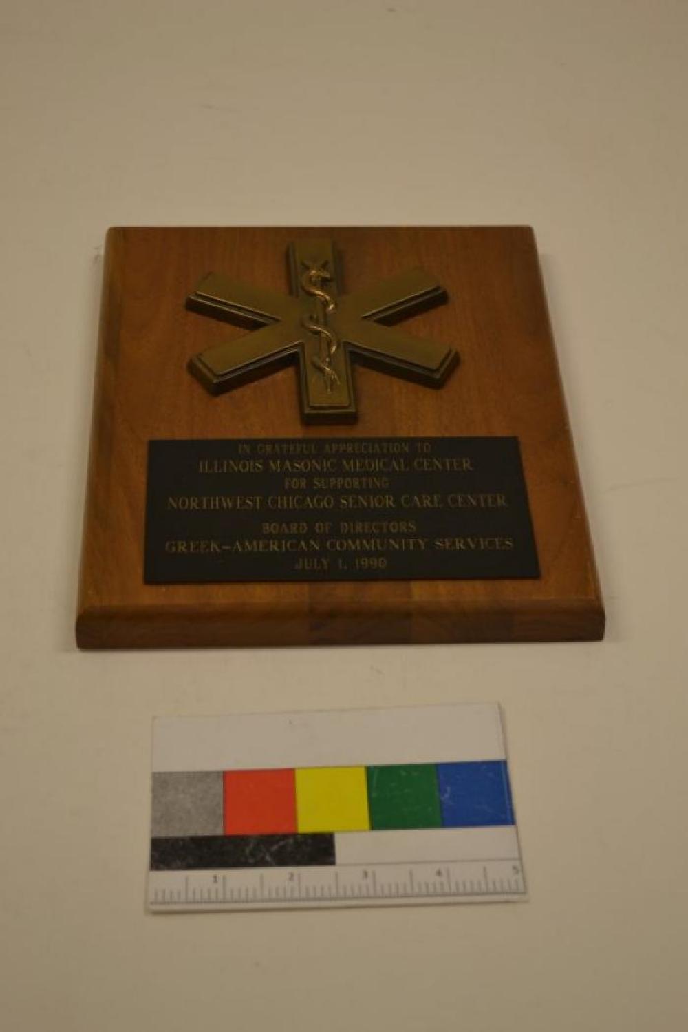 Plaque reads "In grateful appreciation to Illinois Masonic Medical Center for Supporting Northwest Chicago Senior Care Center Board of Directors Greek American Community Services July 1, 1990"