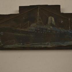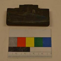 Large, Rectangular printing block of a ship. The metal plate is an etching but the background is in high relief. The ship-some sort of ocean liner- is pictured in profile from an angle. A crumbling piece of paper is attached to the back of the wood with an image that was most likely stamped from this very block.