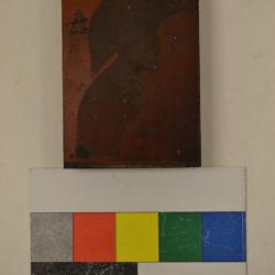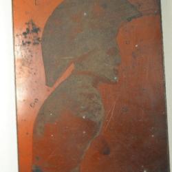 Rectangular, wood printing block with the etched image of an ancient greek warrior. The man is depicted from the abdomen up and is shown in profile. Because the image is worn down and damaged it is not very clear but the figure appears to be a statue of a man with the near arm broken off at the shoulder and a large, plumed, Corinthian helmet covering most of his face.