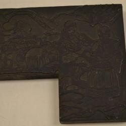 L-Shaped wood printing block. The plate depicts a pastorla scene with two figures (both in traditional dress) stnaidn in a field while a man plays the clarinet (?) for a woman who has her back turned to the viewer. There are sheep visible in the bakcground.