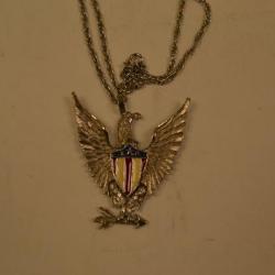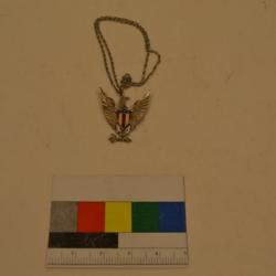 Silver medallion belonging to James K. Chelos. It is unknown why he was given this medal. The medallion shows an eagle clutching an arrow in its talons. On the eagles chest is a crest resembling the American flag. This eagle closely resembles the eagle that appears on the Presidential seal. The medallion is attached to a silver chain and is housed in a black case.