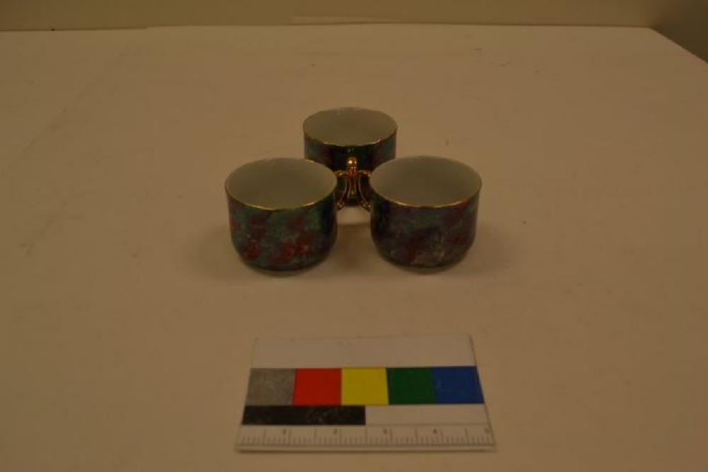 Maker of the cups is unknown. According to Ms. Semeges, there was a fourth cup to the set which was broken.