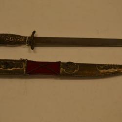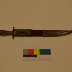 Commemorative knife and accompanying sheath. Sheath is covered with with metal embellishments, decorative wire, and red velvet. The center of the sheath is accessorized in red velvet with decorative metal wire making 'X' shape across the top of the red velvet. A metal relief of an eagle and a snake adorn the sheath above the red velvet section. Below the red velvet, a red jewel inset. The tip of the sheath has a metal embellishment shaped like a tassel. There is a chain attached to the sheath. The handle of the dagger is decorated with etched designs including circles and flowers. The end of the handle folds in on itself. The handle widens out at the point where it attaches to the blade. The blade is long and silver and has decorative cuts in it that resemble branches or vines. In the center of the blade, the number "1821" is etched. This is most likely commemorative of the Greek revolution of 1821. The blade is in too good of shape to be from 1821.