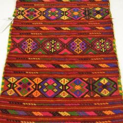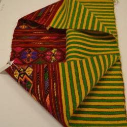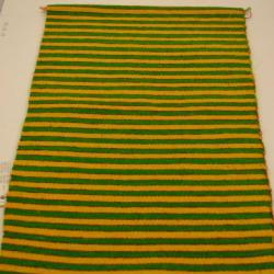 Pillow case slip, with an open bottom and stop made of course wool. Decorative purposes only, not for general use. Colors: multi-colored on one side, Colors: green and yellow on the other side. Multi-colored sided is woven in a tribal pattern, mixture of lines and shapes. Mixture of tight and loose weave. Green and yellow side, vertical strips only. Evidence of tight, small weave. Excellent craftsmenship, not homemade, possibly purchased.