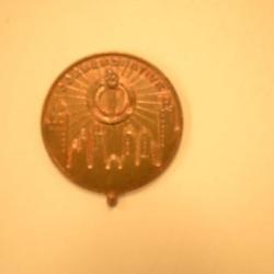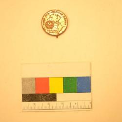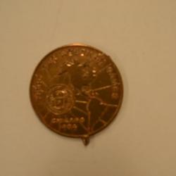 A bronze commemorative medal from the Third Pan American Games. One side of the medal depicts North and South America, the location and date of the games in text, and a city of Chicago seal. Lines are extending away from this seal. There is a star located on North America indicating the location of the games in Chicago. The reverse side of the medal has a city scape along the bottom. The word "commemorative" is arched over the top and a torch superimposed on a ring with incised lines around it is placed over the city scape. Lines are extending from this ring. There is a small bronze bit that protrudes from the bottom of the medal.