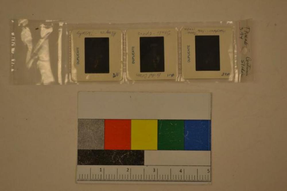 Three slides in a plastic sleeve. The slides are of Bridal dresses. The label on the plastic sleeve reads "Costume Slides." Found in box with Barbatsuly collection.