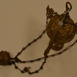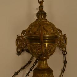 A bronze thurible with decorative scrolling around the sides. There is a smaller section attached with three chains to the larger section. The larger section has three wings off of the spherical body which the chains are attached to.