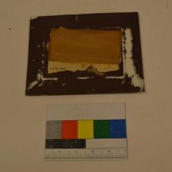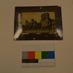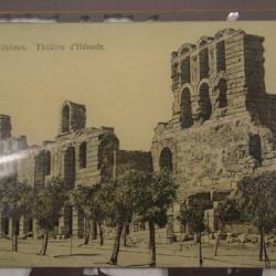 Postcard glued to a transparent glass plate. The postcard features the text, "Athenes. Theatre d'Herode" with a receding view of the back of the Herodes Amphitheater (you do not see the semicircular seating area) with a series of trees that have been colored green. The postcard is in black and white. The glass plate appears to be acting as a framing device for the print and there are intersecting gold lines (inscribed on the glass's underside) around the print as a framing device. The plate was painted with brown paint which has worn down and is chipping away. When looking at the underside of the plate, you can make out the lines for an address and the dividing line between letter content and address that are the trademarks of a postcard.