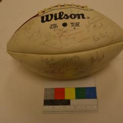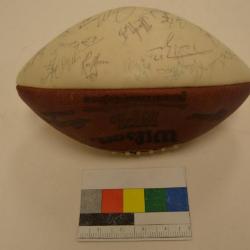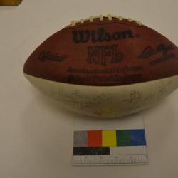 A white and brown Wilson NFL football, slightly deflated. Signed by the 1987 Chicago Bears. There are some signatures missing and some are heavily faded.