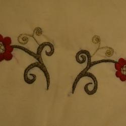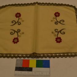 Beige linen rectanglar doily. Has gold scallope trimmed edges and a red embrodered flower with the same gold thread as its stem in each quadrant- mirror image of each other on each side