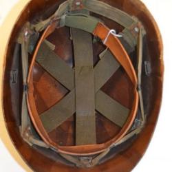 A brown/tan helmet liner. There are leather and fabric strapes inside to fit to the head. The chin strap is missing.