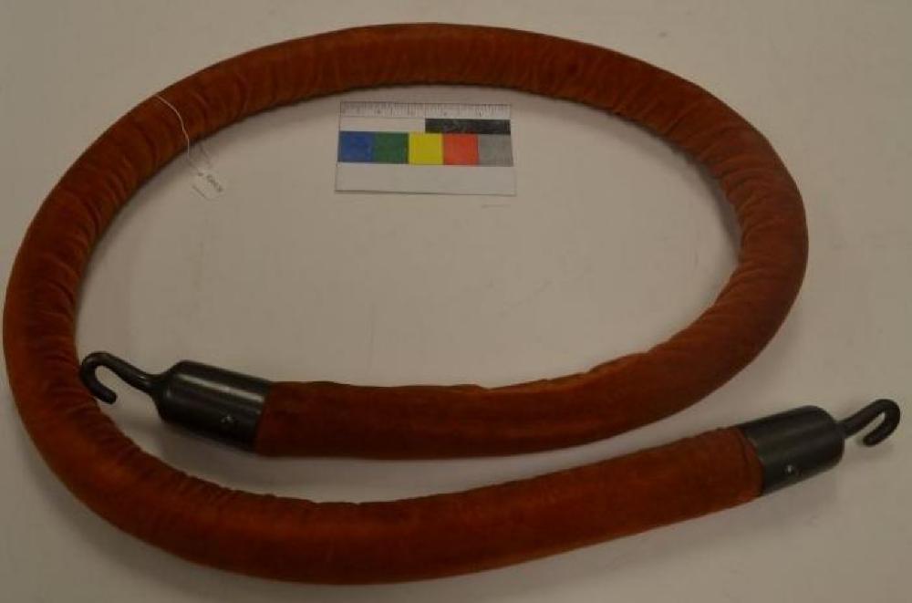 Orange long Stanchion rope. At each end there is a metal hook, made out of alluminum or steel.There are two bolts inserted into the base of the metal hook castings to anchor them to the stanchion rope. These bolts are on opposite sides of eachother