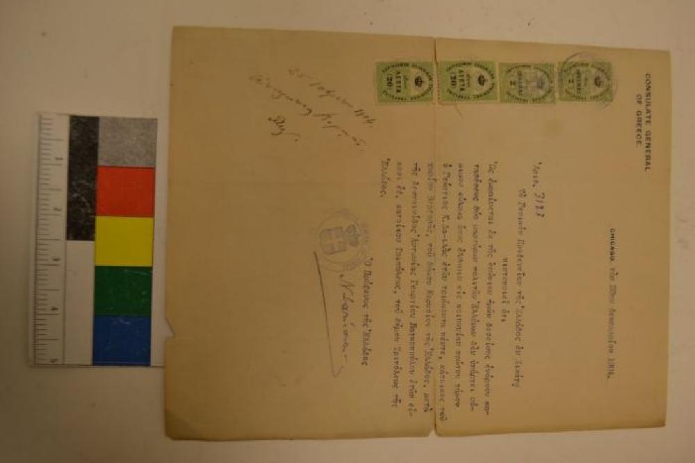 A letter from the Consulate General of Greece, in Chicago, dated 1904.The letter is fully typed in Greek and roughly translates that Teorgois K Dailas lived in Versovas for five years after his parents had been residents of Tripoli for twenty years. The paper that this is printed on is yellowed with age but the blue ink that was typed with is still clear and the signature on the bottom is as well. It has a stamp next to the signature that is of the consulate general Greece in Chicago around the Royal Greek seal of a crest with a cross in the center topped by a crown. Along the left side of the paper, there is a row of four green cancelled stamps, all worth 2 drachmas. There is a handwritten note in Greek underneath the stamps.