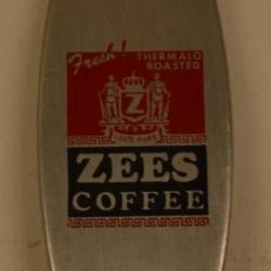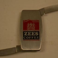 A silver money clip for "Zees Coffee." The clip has a red and black label on it. The red label says "Fresh, Thermalo Roasted" at the top. Below is s seal with "Z" in the middle and "100% Pure" at the bottom. Below the red label is a black label that reads "ZEES COFFEE" The clip has a folding knife on one side and a file on the other.