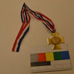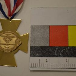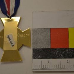 Golden equaline cross medal attached to a red, white and blue ribbon. The plaque in the center of the medal reads "United Greek Orthodox Churches. Chicago, 1910-1960, Fifty Years of Christian Service. Annunciation, St. Demetrios." On the back of the medal "Judge James Chelos, Trustee" is engraved.