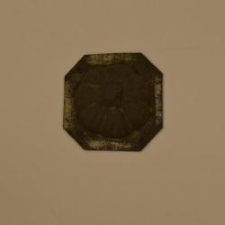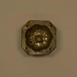 This is the top portion of the pumpkin candy mold. The entire thing is made out of metal, most likely tin. The flat area, which would connect to the other half of the mold is an octagonal shape, but four of the sides are longer than the corner sides. On the shorter sides there are four circular protrusions that are used to help connect the two sides together. Looking at the flat side the top of the pumpkin shape goes down into the metal with grooves and veins that pumpkins have as well as the a little square stem. The shape of the top is less indented as the bottom one because it is shorter.