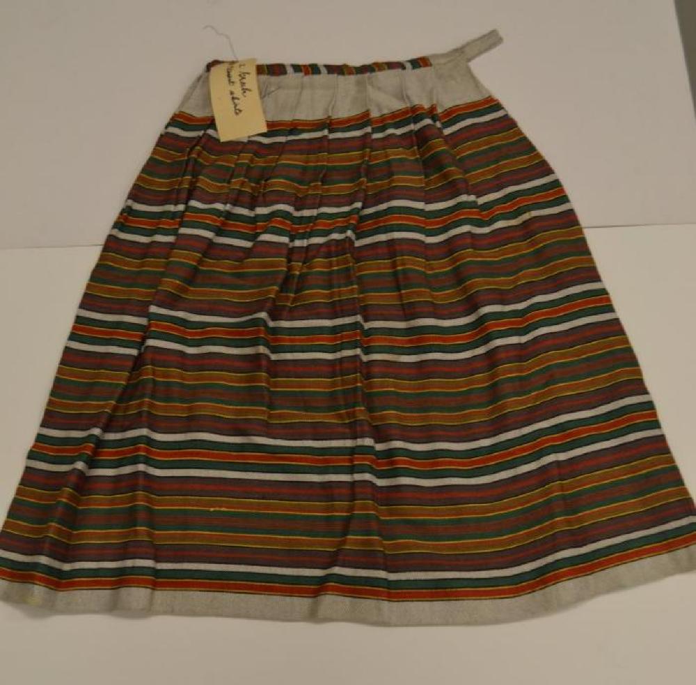 Little over knee length, handmade peasant skirt. The waist band is about an inch thick. There is a vertical, multicolored pattern that goes around the entire waist. Starting at the clip/opening of the waist: there is a solid white space followed by a vertical red rectangle, about half an inch thick. Set right next to the red is a green rectangle, same size. Both are bordered with a black line, but within the black line of the red there is also a yellow border resting on the black. There is another white blank space, about half an inch wide followed by a larger brown square. There is a thin red rectagle set in the middle. The square is boarded in black like the colors before. Set to the black border is a yellow line followed by a lighter borwn rectanlge, little less than an inch thick. There are two thin red lines that follow and then another yellow. After is a green rectagle, also a little less than an inch thick followed by four red lines, which have the same green lines in between each. Following is another green rectangle, which is followed by a yellow line and then two more red ones. There is another light brown rectangle after that followed by another thin yellow line. There is another black that rest next to a dark brown square with a thin red rectangle in the middle of it, then closed off by a black line. There is another half inch gap of white before there is another green recangle, borded in blac, which is followed by a red bordered with yellow and another green. This set of three seperate blocks of patter repeats around the waist four more times.
