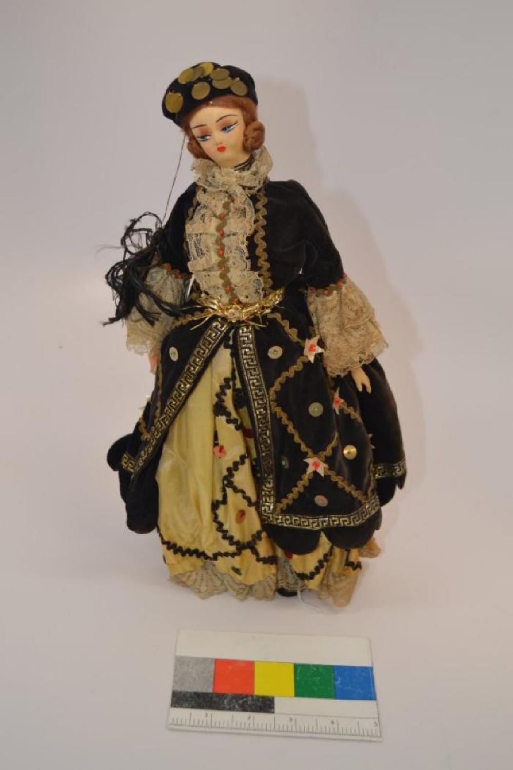 Large Greek doll (female) with a painted fabric face and plastic hands,arms, legs, and feet. She has light red hair made from fabric, and tied in buns on over each ear. Her legs are covered in some type of stretchy fabric. She wears a a black velvet hat with gold coins and a black thread tassle on the left side, a black velvet jacket trimmed with lace on the chest and on the ends of the sleeves, with red beads as buttons down the lace in the front and around the sleeves with gold fabric trim, and a gold braided ribbon belt. She has a two-tiered skirt, with a black velvet top layer and cream/yellowish fabric bottom layer. The velvet layer is decorated with gold trim making diamon patterns on both the left and right front sides. They have silver sequins with green beads sewn in the centers of the diamonds, and silver stars with red beads sewn on the angles where the diamonds meet. trimed with a Greek key pattern, and the Greek key trim is also worn around the doll's neck as a necklace. Below the key pattern trim, the bottom of the skirt has a scalloped edge. In the diamond shapes there are different colored sequins sewn in the centers. The bottom layer has a zig-zag pattern of thread making diamond shapes along the front, and lining the bottom of the skirt. The skirt is pleated and lined with lace along the bottom. There seems to be staining on the edges.