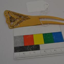 Bride's yellow plastic hair fork molded in a swirly floral pattern at the top and inlaid with black and diamon rhinestones.