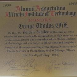 Awarded to George Thodos on the 50th anniversary of his graduation from Illinois Institute of Technology in 1938.