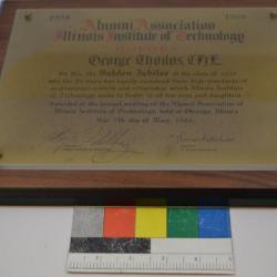A commemerative plaque of wood and glass. The wood is brown painted black around the borders and has two hanging notches on the back. Attached to the wood with four metal-topped pins with a star printed on them in each corner is a rectangular piece of glass. Under the glass is printed on a gold background: "1938 1988. Alumni Association Illinois Institute of Technology. Honors. George Thodos, CHE. On this, the Golden Jubilee of the class of 1938 who for 50 years has loyally susained those high standards of professional activity and citizenship which Illinois Institute of Technology seeks to foster ina llher sons and daughters. Awarded at the annual meeting of te Alumni Association of Illinois Institute of TEchnology, held at Chicago, Illinois this 7th day of May, 1988." Signed by the President of IIT and the President of the IIT Alumni Association.