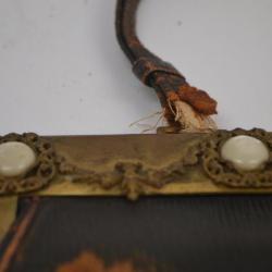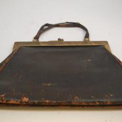 Brown leather handbag. On the front, pieces of leather are flaking off to show an orange-rust color underneath. The leather is slightly textured in a vertical design. The top has a brass type edge and clasp. 5 pearl colored, circular jewels border this edge. Each jewel is surrounded by a wreath-like ornate design. The opposite edge has no ornamentation--just scratches and marks. There are two thin leather straps at the top. The base of the straps appear to be fraying. The interior is a dark green colored leather liner with a pocket on one side. There is a black tag in a top corner that says "Warranted, Genuine Goat".
