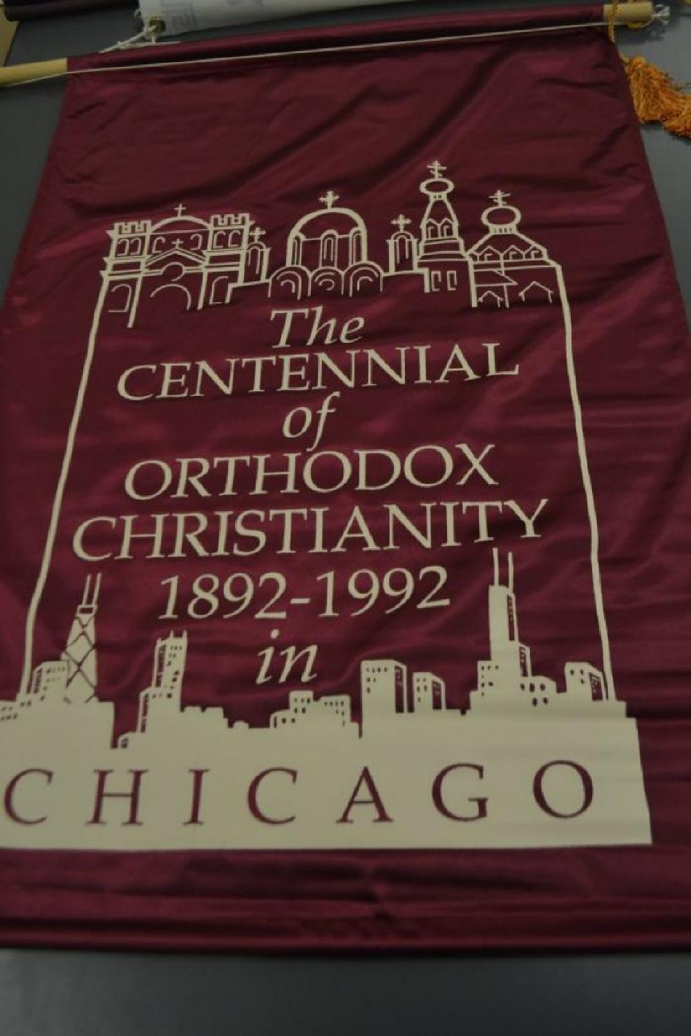 Cloth banner on a wooden pole with gold tassels. The banner is maroon with cream clored graphics. It has an image of church domes and the chicago skyline, and reads: The Centennial of Orthodox Christianity in Chicago, 1892-1992.