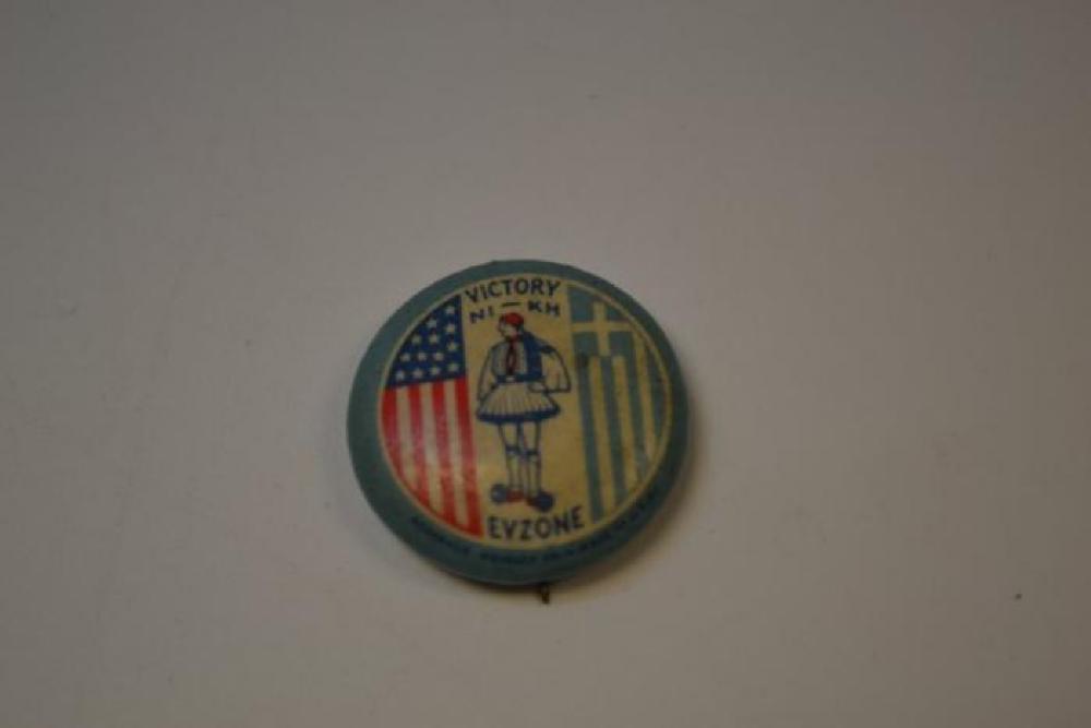 This button was donated by Jenny Boondas. It was part of a collection belonging to her brother-in-law, Constantine Brown, who died in 2014. This button is from World War II. It was likely made for the Greek American community to support both the Greek and American efforts in the war. "Nike" is the Greek word for victory. The button either celebrates an Allied victory in the war or simply promotes the idea of future victory. Evzones was the name of several historical Greek military units and is now used to refer to members of the Greek Presidential Guard.