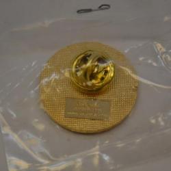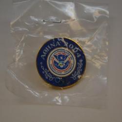 A gold-colored lapel pin. The front of the pin is blue and white. The center part contains the seal of the United States Department of Homeland security. The seal consists of a blue and white eagle against a circular blue background. In front of the eagle's chest is a shield. The top of the shields is blue and contains 22 stars. The bottom part of the shield is split in two. The left side depicts grass and a white mountain against a blue sky, while the right side depicts waves of the ocean. The eagle has an olive branch in the talon on the left side of the pin and a bunch of arrow in the talon on the right side of the pin. Its head is facing toward the left side. Surround the eagle is a red circle, which the eagles wings break through at two points. Around the red circle is a blue circle. Between the two circles, printed in blue, are the words "U.S. Department of" at the top and "Homeland Security at the bottom. The outer part of the button is blue. At the top, the Greek name for "Athens" is printed in white, followed by "2004". On the bottom is an image of the Olympic rings. On either side of the rings is an image of a laurel branch in white. There is a gold-colored ring between the inner and outer portions of the front design. The edges and back are made of the same metal. The metal at the back is covered with small dimples in a grid pattern. The back has a pin with a butterfly clutch fastener. Below this is a smooth rectangle containing the following: PinCrafters 888-388-4288