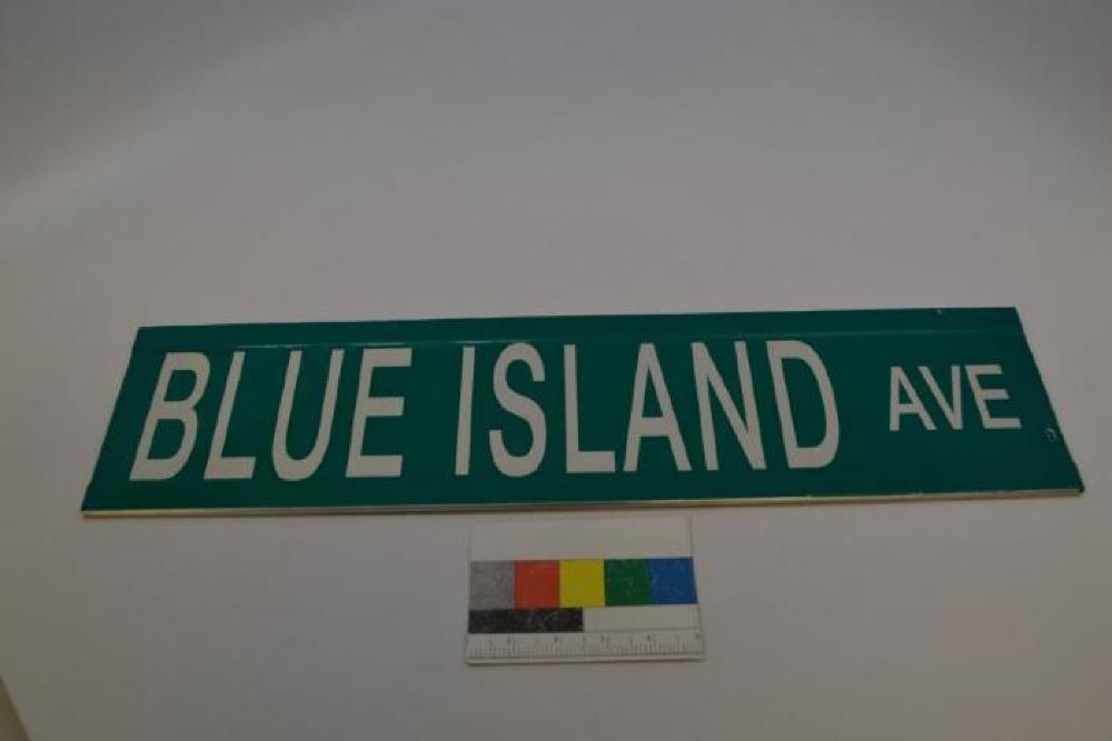 Green metal street sign. In white capital sticker letters reads "Blue Island Ave" on both sides of the sign. There are markings where the sign had been secured to something. The sign has ridges above and below the letters.