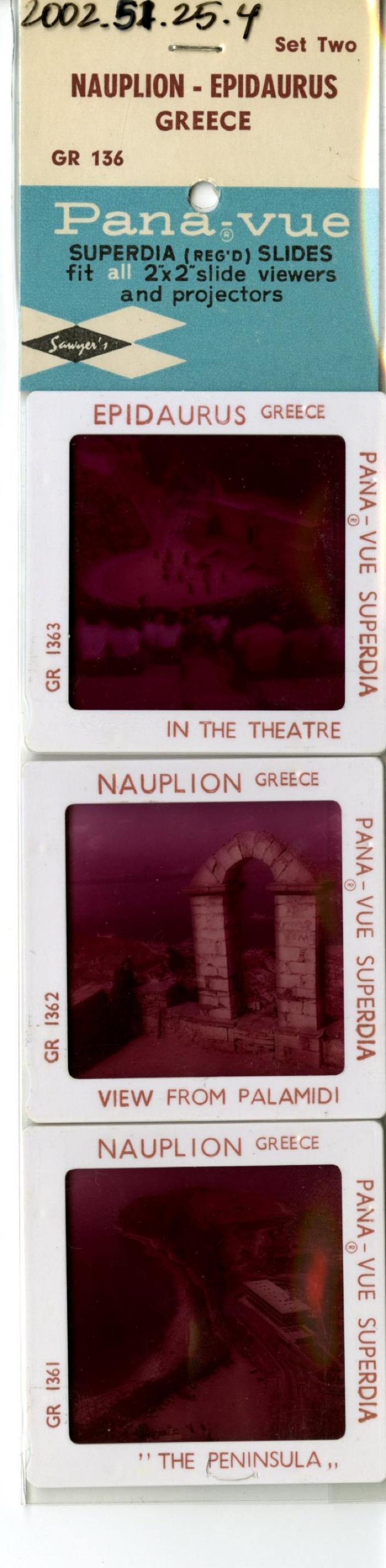 A set of three slides with white plastic frames. Each slide has an image of a landmark on the island of Corfu. The slides, along with a tag, are encased in a plastic wrapping, which is stapled to the tag. The tag identifies the subject of the slides as "Nauplion-Epidaurus" in "Greece." This set of slides is "set two," and the manufacturer is "Pana-vue." These particular slides are "Superdia Slides," which "fit all 2" x 2" slide viewers and projectors. The first slide is identified as being an image from "In the Theatre," the second is a "View from Palamidi," and the third is "The Peninsula." The words "Made in Belgium" are printed on the back of each frame.