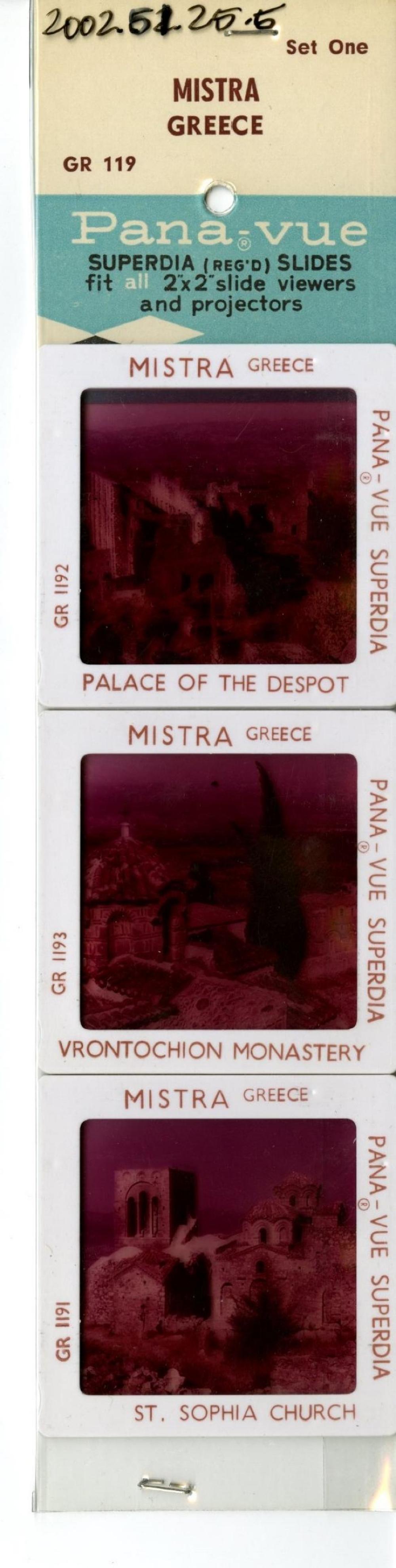 A set of three slides with white plastic frames. Each slide has an image of a landmark on the island of Corfu. The slides, along with a tag, are encased in a plastic wrapping, which is stapled to the tag. The tag identifies the subject of the slides as "Mistra" in "Greece." This set of slides is "set two," and the manufacturer is "Pana-vue." These particular slides are "Superdia Slides," which "fit all 2" x 2" slide viewers and projectors. The first slide is identified as being an image of the "Palace of the Despot," the second is "Vrontochion Monastery," and the third is "St. Sophia Church." The words "Made in Belgium" are printed on the back of each frame.