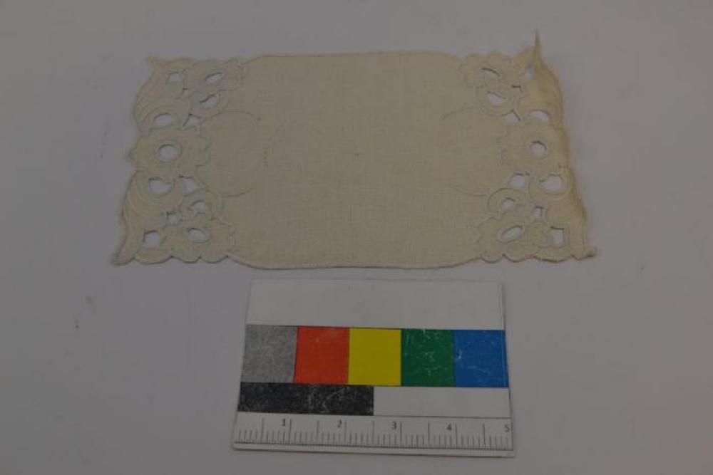 Rectangular linen cream-colored cloth with white thread. On either end, there are cutouts of three flowers, where the biggest flower is bordered by two wing-like leaves. Two lines go down from the biggest flowers in a C shape.