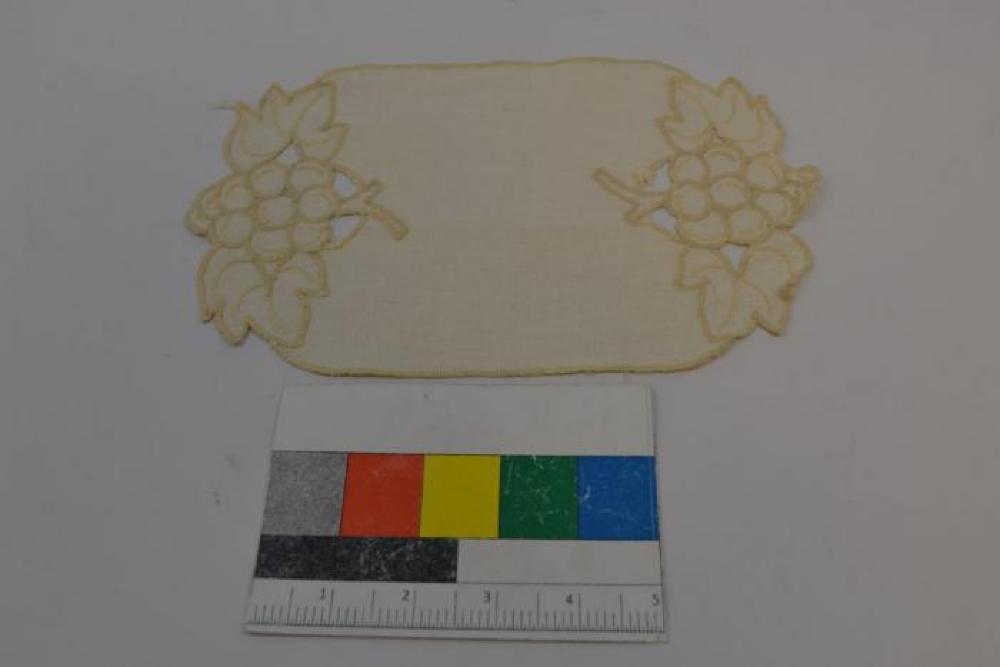 Small rectangular cutwork mat with rounded corners. The top and bottom feature a large stem of ten grapes, with a leaf on either side. One of the openings in a leaf hasn't been cut out. The fabric is cream-colored, and the threading is more of a yellowish.