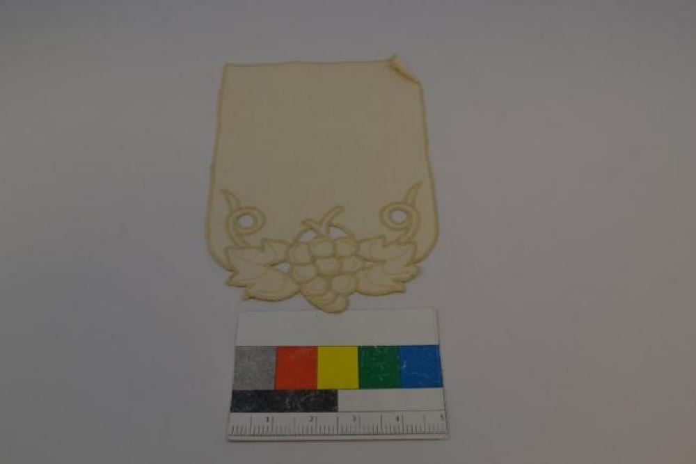 Small rectangular cutwork mat. The bottom features a large stem of ten grapes, with a leaf on either side of the vine and vine designs behind the leaves. The fabric is cream-colored, and the threading is more yellowish.