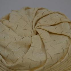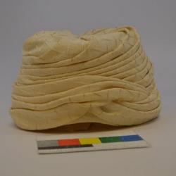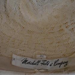 Off-white hat with multiple folds. The fabric of the hat comes together at the top in a swirling pattern. The front of the hat rises up a bit further than the back. The fabric has lines that cross to form a grid-like pattern. The lines are thicker in the middle, then thin out. They are thick where the intersecting line is thin. There is an orange-ish stain on the front. The inside of the hat has a lacelike material, with a tan colored headband. There is a tag in the hat that reads " Marshall Field and Company" and says that the hat is a size 50. Hat is located inside hatbox (1999.9.10).