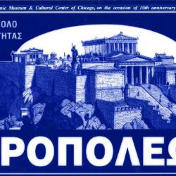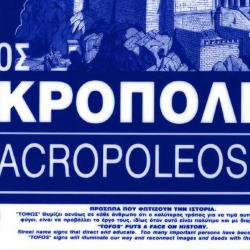 Blue sign with a picture of the Acropolis on it in white and blue. There is writing in the top left corner in Greek, as well as directly below the picture. Below the Greek, it says "Acropoleos str." The bottom has a white border with writing in Greek. Below the writing in Greek, it reads "Tofos puts a face on history. Street name signs that direct and educate. Too many important persons have become forgotten. Tofos signs will illuminate our way and reconnect images and deeds with their names." There is a circle with a man in it in the bottom left corner and another circle in the right corner with Greek writing that says "Puts a Face on History" in English. The top has a blue add on that reads "Dedicated to the Hellenic Museum & Cultural Center of Chicago, on the occasion of 10th anniversary May 17 2002."