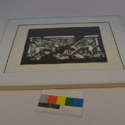 The lithograph was donated to the museum by Ionna Kilimi, who was the artist. The lithograph was made in 1994 and is titled "A Culture in Crisis." The back says that it was "Inspired by a Greek Sarcophagus"