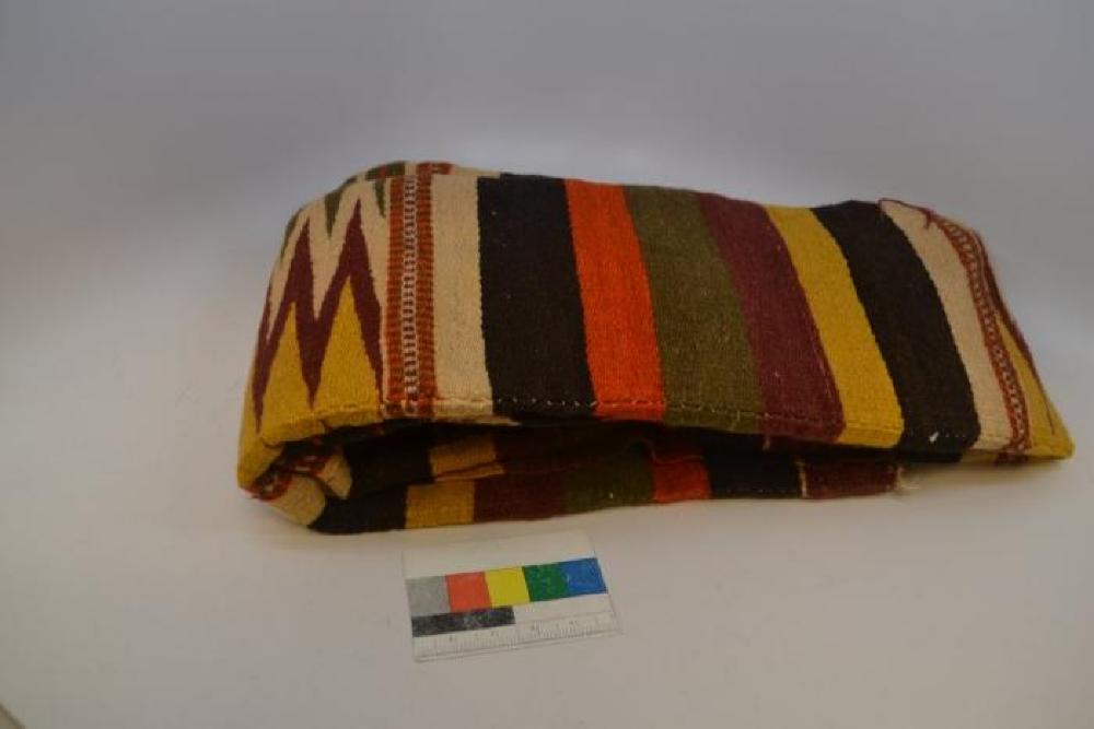 Unmarked textile was found in a box in the collections storage. It was made on a loom, as can be seen by the multiple panels sewn together.