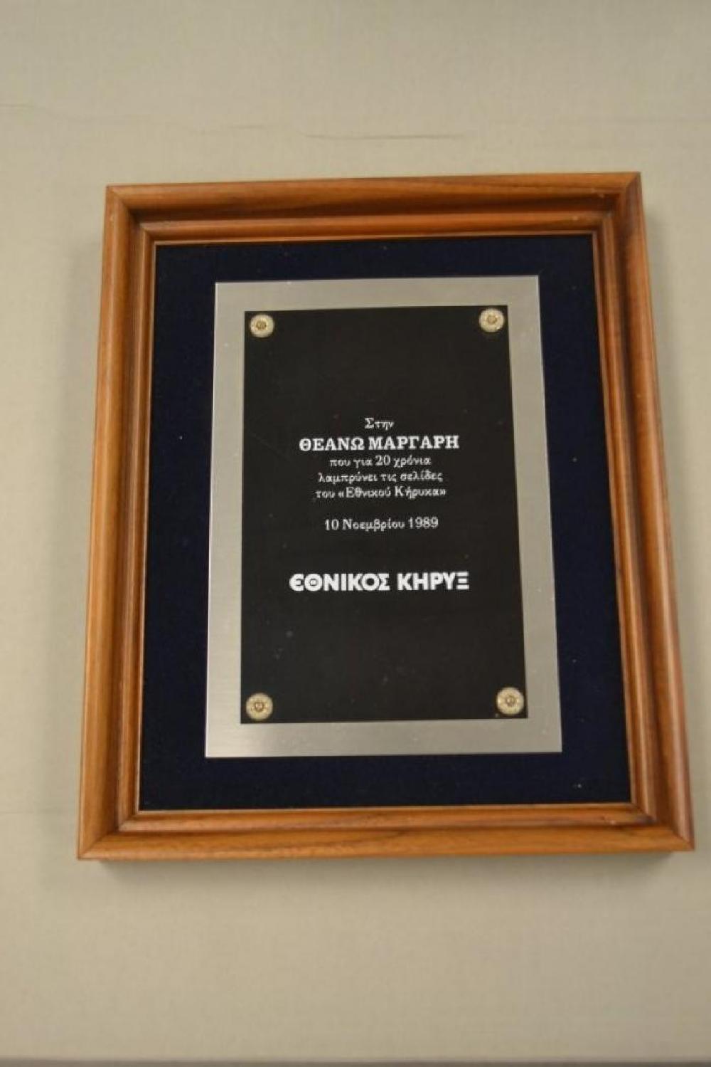 A plaque dedicated to Theano Margaris written in Greek. Dated 11/10/1989