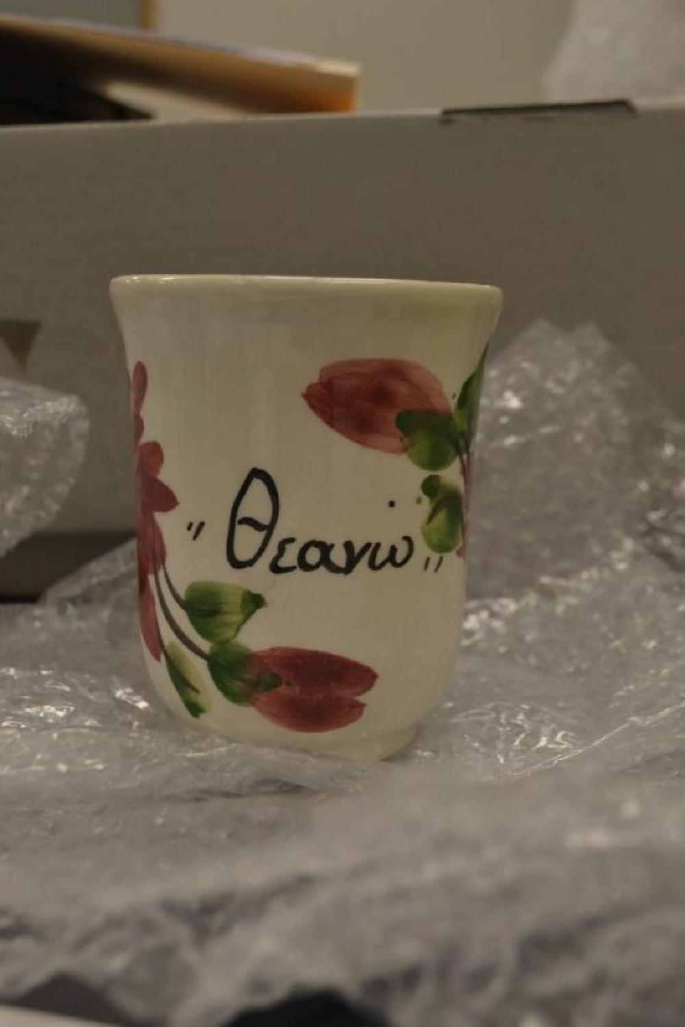 Ceramic cream colored cup painted with pink flowers and green leaves. "Theano" is painted on in Greek as well. The paint is chipping on the lip of the cup.