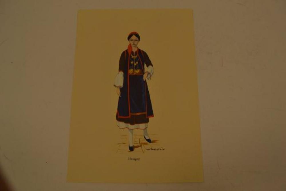 Cream colored print with a woman wearing a headscarf that covers the back of her head, a brown dress lined with red, this is over a white dress with sleeves longer than the brown dress and is also lined with red. Over this she wears a blue apron with a red sash and gold jewelry. Over all three she wears a blue sleeveless coat outlined in red. She wears white tights and dark blue shoes. She stands on faintly outlined steps and looks down with one hand on her hip and one hand at her side. Underneath her feet in Greek is her region, "Epirus."