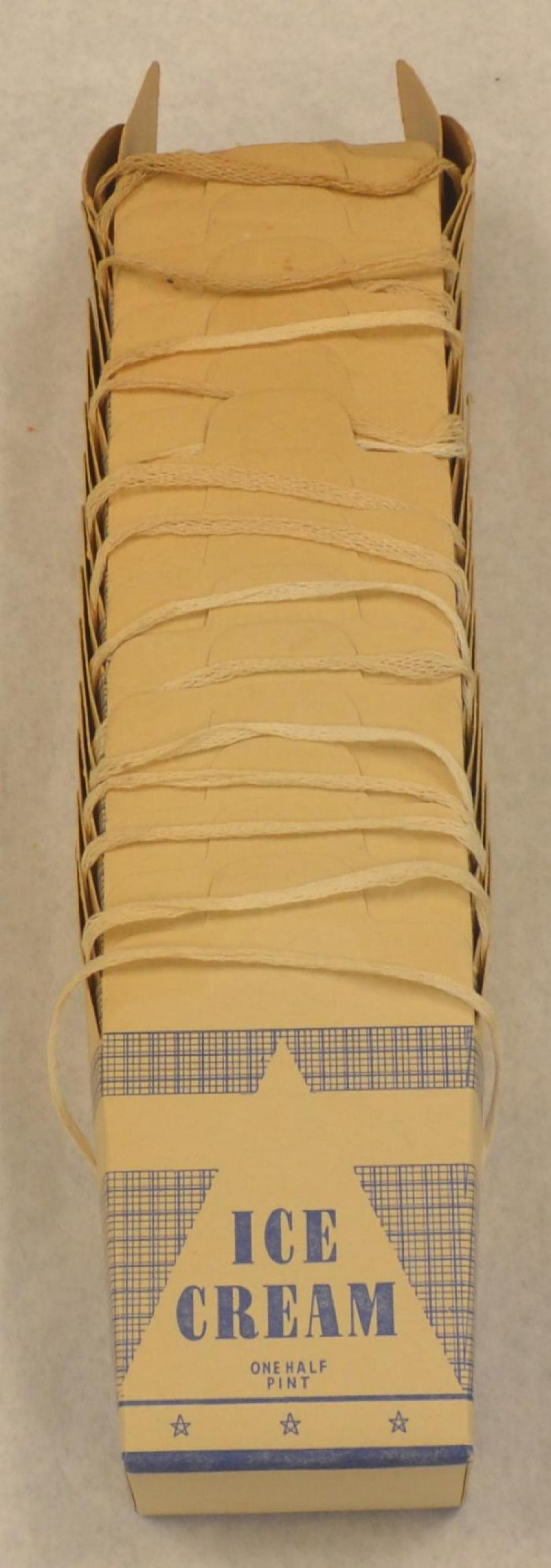This is a stack of 10 small, half pint cardboard ice cream containers. The fronts and backs of the containers are identical and off-white in color. The background is a blue, grid pattern with a large white triangle in the middle. "Ice Cream" in large blue letters is printed on the triangle, with "one half pint" printed below it. There are small, decorative stars running along the bottom of the container, on all four sides.