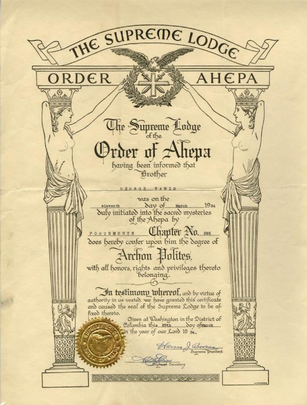 Large certificate on paper. The decoration consists of statues of women on pillars on both the left and right side holding up a wreath with a bird. On the top on a decorative scroll reads "The Supreme Lodge" and under that reads "Order Ahepa". The rest of the document reads: "The Supreme Lodge of the Order of Ahepa having been informed that brother George Vanis was on the eleventh day of March 1934 duly initiated into the sacred mysteries of the Ahepa by Portsmouth Chapter No 295 does hereby confer upon him the degree of Archon Polites, with all honors, rights and privileges thereto belonging. In testimony whereof, and by virtue of authority in us vested, we have granted this certificate and cause the seal of the Supreme Lodge to be affixed thereto. Given at Washington in the District of Columbia this 29th day of March in the year of our Lord 1934." The certificate is then signed by the Supreme President Harris J. Booras and by the Supreme Secretary Achilles Catsonis. A large golden seal is located at the bottom left hand corner.