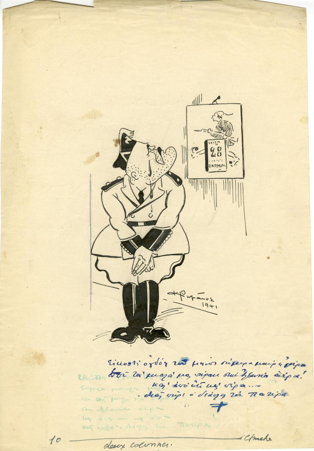 Greek cartoon [Mussolini] from The Sphinx magazine. The caption reads: {Text in Greek} [The 28th day of the month today and Albania is gaining momentum. From there....we're headed to hell. (very loose translation, Greek saying that rhymes and that can't be translated)].