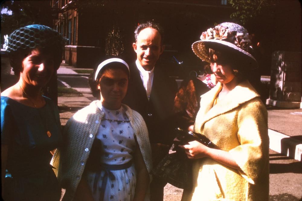 Photograph of four people standing outside of what appears to be a church. To the left of the photograph, is the individual wearing a blue hat and blue dress. In the middle are two people. A child wearing a white pattern dress with a blue ribbed tied around the waisted, a cream-colored jacket, and a white headband. Located behind the child and to the right is a person wearing a black suit and white dress shirt. To the right of the person wearing the suit is an individual who is dressed in a formal yellow coat and floral hat.