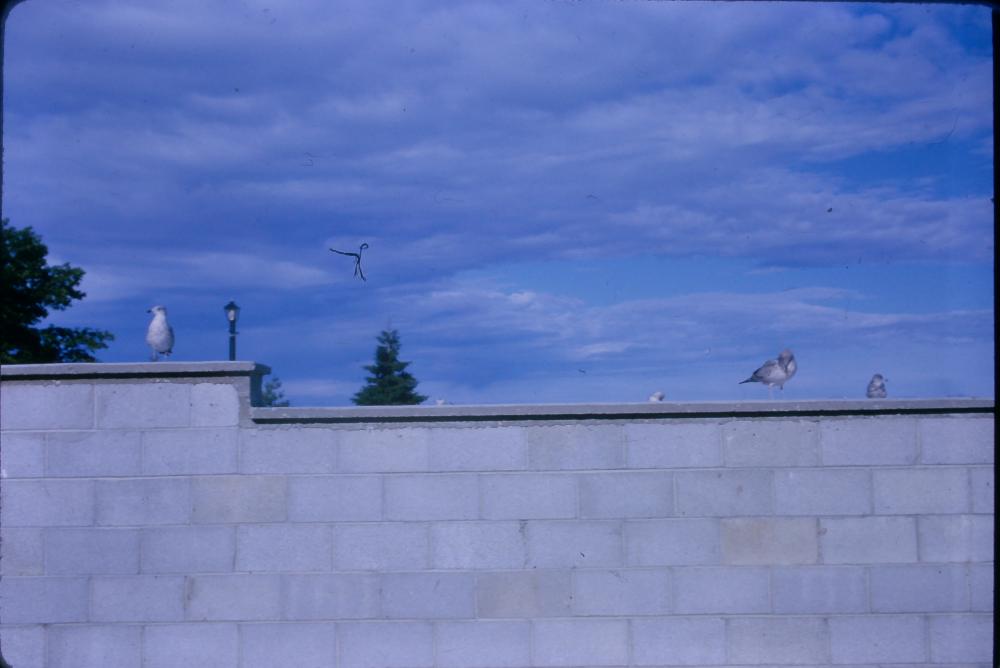 Photo on wall with trees and lampposts behind it. On top of the wall are several birds.